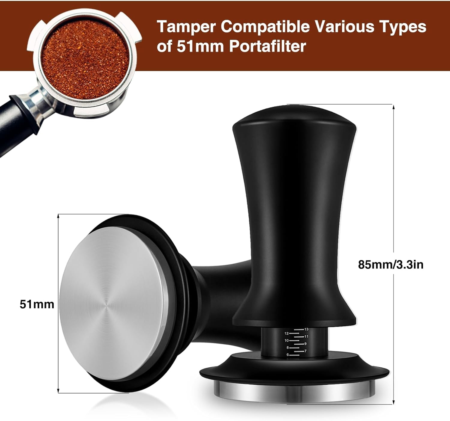 - Our coffee tamper is designed for 51mm portafilters and features a built-in spring mechanism, eliminating the need for any additional adjustments. Its ergonomic handle provides a comfortable grip, making it easy to effortlessly compact coffee grounds